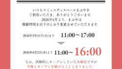 お知らせ まぶや 開館時間変更のお知らせ いつもまぶやにお越しくださるみなさまへ。4月からの 営業時間変更 についてお知らせです。2026年4月より、まぶやの開館時間を以下のとおり変更させていただきます。現在11:00〜17:00▼2026年4月2日(木)より11:00〜16:00... 2026.03.31 お知らせ
